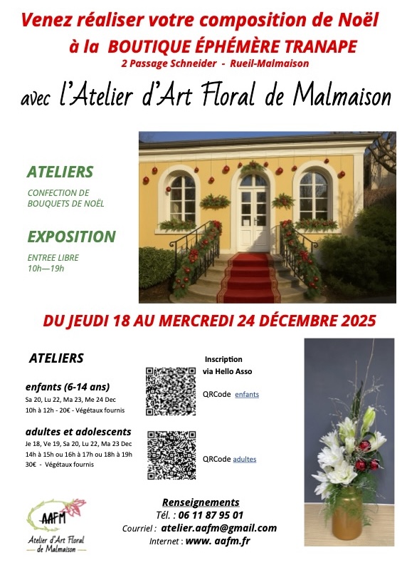 – A l’occasion de Noël, des ateliers à la carte sont programmés du 17 au 24 décembre. Ils auront lieu exceptionnellement dans le local de la boutique éphémère « Tranape » de Rueil (voir photo et plan en bas de page).