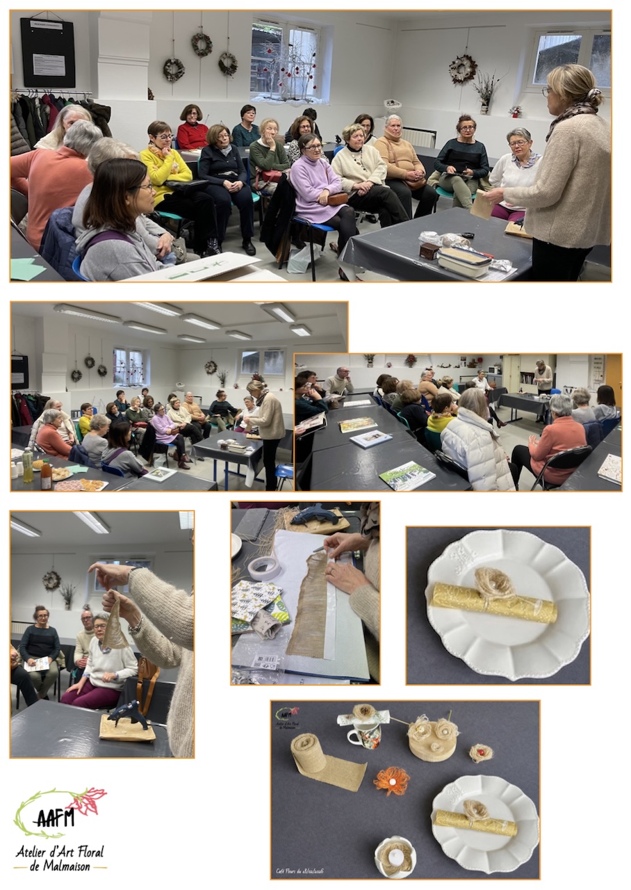 Cette première séance « Café fleurs » de l’année a fait l’objet d’une démonstration de Françoise, basée sur une décoration de table en mettant l’accent sur le rond de serviette.
